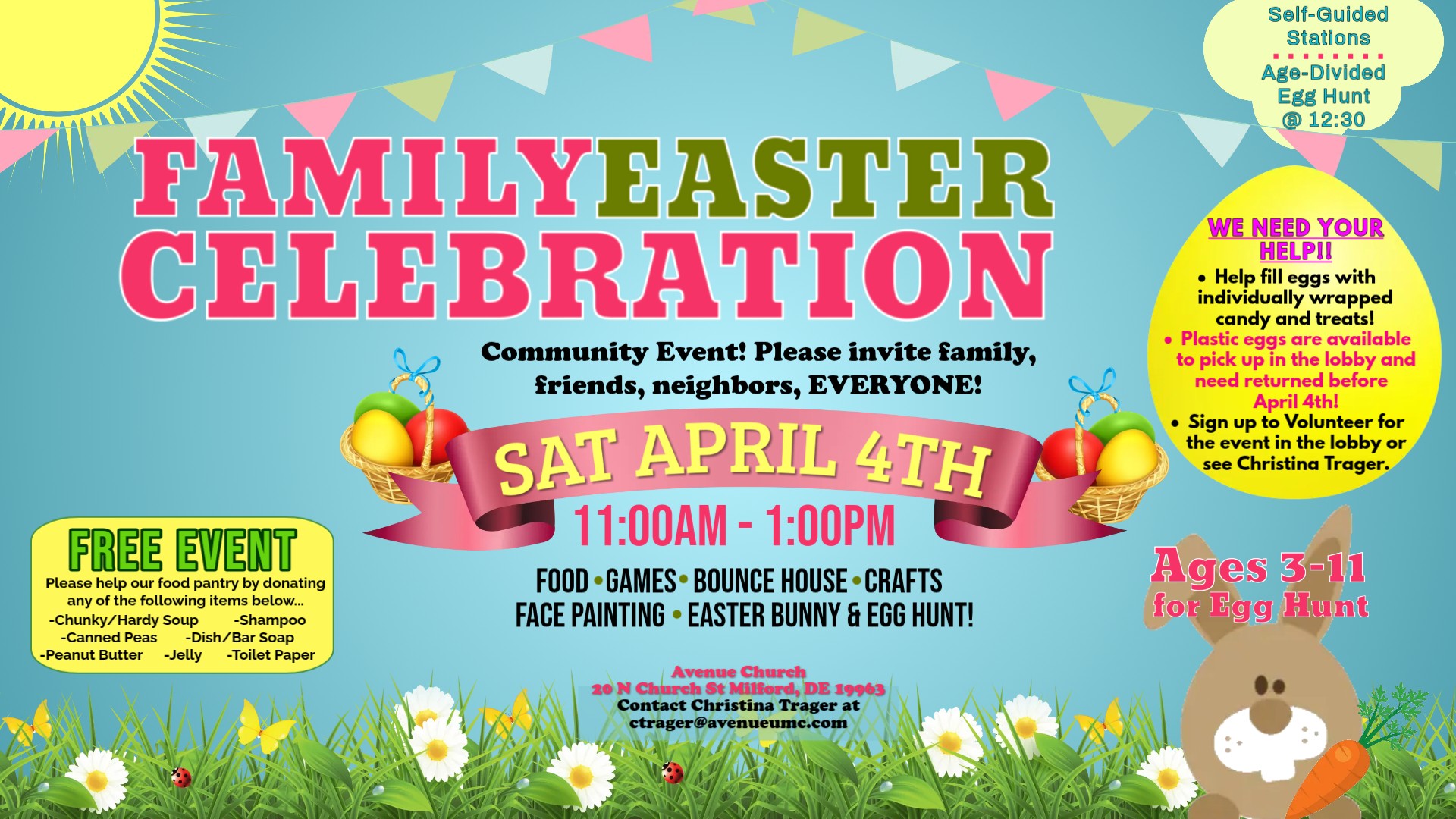 Avenue United Methodist Church Easter Egg Hunt Avenue United Methodist ChurchEventsCalendarEaster Egg Hunt « All Events April 4 @ 11:00 am - 1:00 pm Event Navigation « Line Dancing + Google Calendar+ iCal Export Details Date: April 4 Time: 11:00 am - 1:00 pm