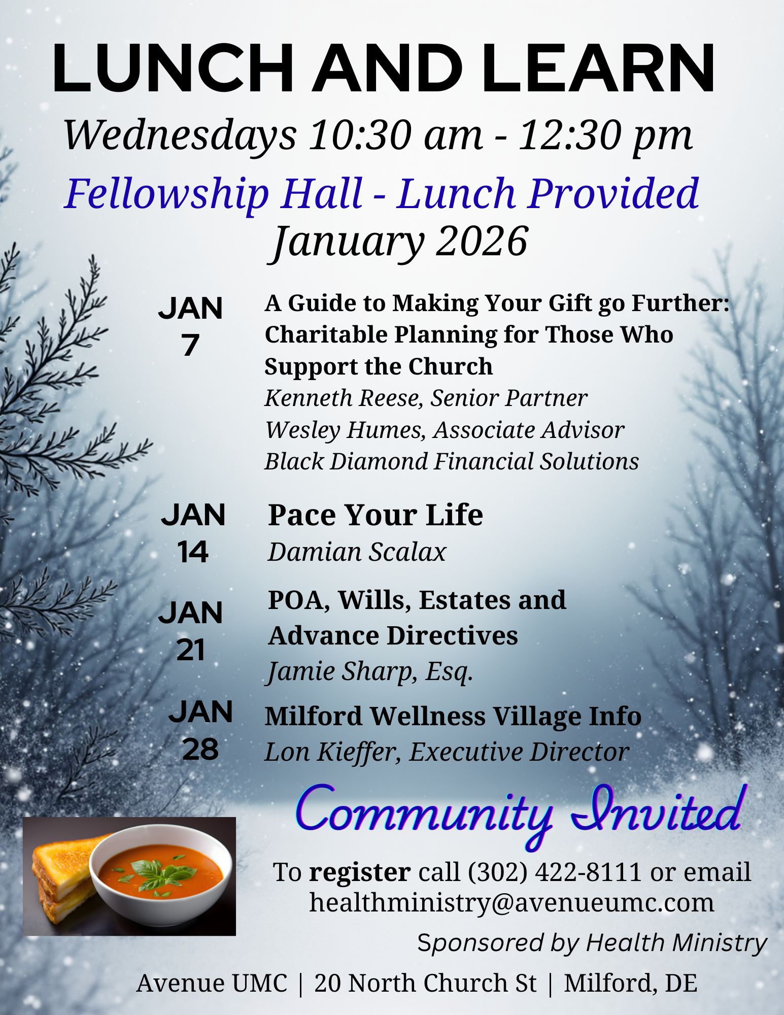 Avenue United Methodist Church This event has passed. January Lunch and Learn Avenue United Methodist ChurchEventsCalendarJanuary Lunch and Learn « All Events January 7 @ 10:30 am - 12:00 pm Event Navigation « Line Dancing + Google Calendar+ iCal Export Details Date: January 7 Time: 10:30 am - 12:00 pm